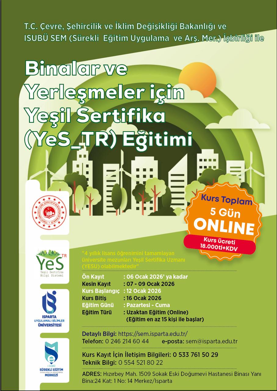 BİNALAR VE YERLEŞMELER İÇİN YEŞİL SERTİFİKA (YeS_TR) EĞİTİMİ (12-16 OCAK 2026)